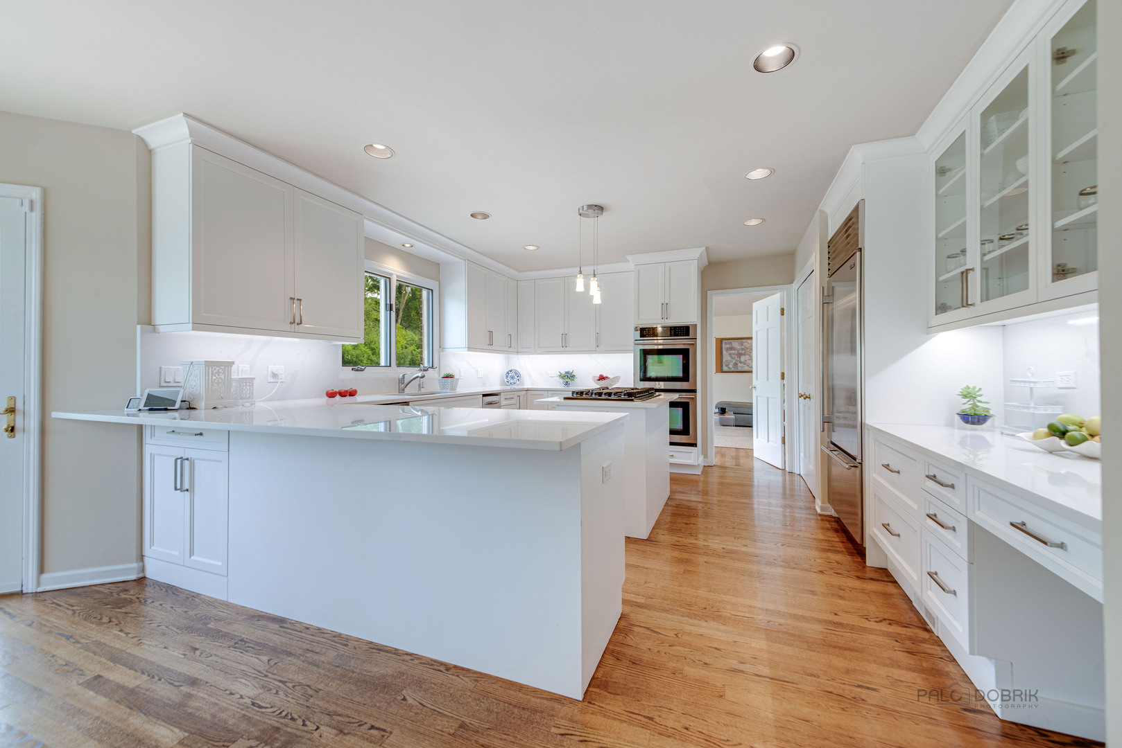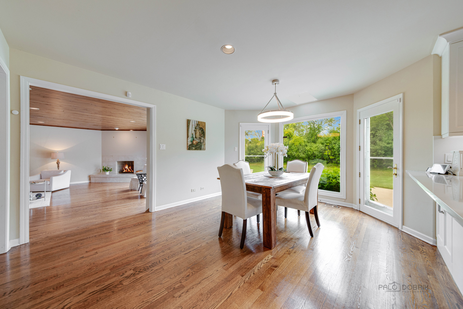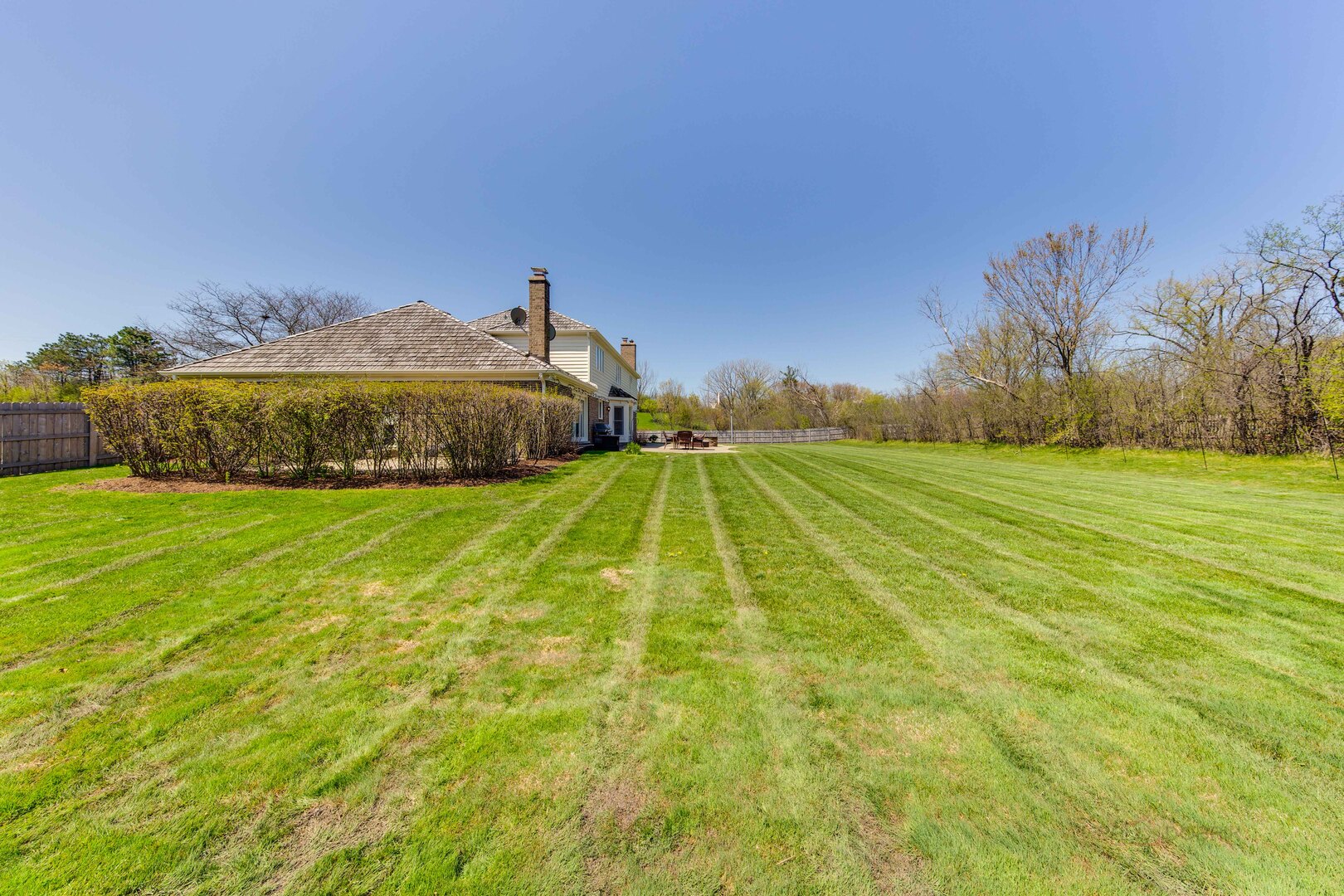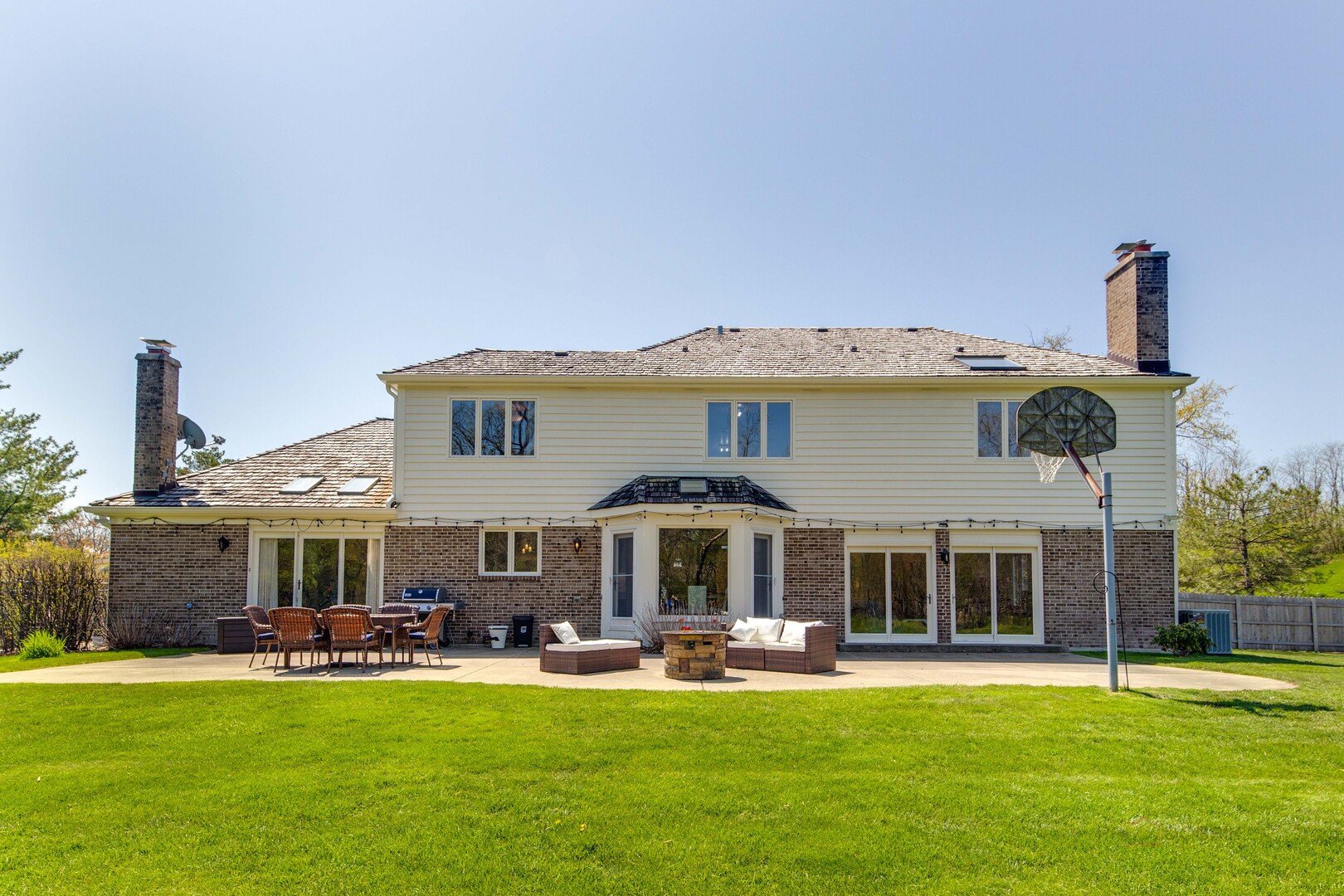 At the end of a quiet cul de sac, this East Lake Forest brick home, with NEW ROOF '24, sits on almost an acre with fenced in backyard, creating a private oasis! Located in desirable Onwentsia Gardens, this 5300+ sq foot home, on all three levels, is filled with sensational natural light and gorgeous hardwood floors throughout. The lovely double front doors open to a foyer, formal dining and living room. The gourmet white kitchen, completed in '18 features quartz countertops, a six burner Viking cooktop, Miele dishwasher, Sub Zero refrigerator, Jenn Air double oven, and generous cabinet storage space with under counter lighting. There is a large breakfast area with a wall of windows and doors, overlooking the large amazing patio and fenced in backyard. The windows and doors overlooking the backyard extends into the large family room and office/study that provide great flow for indoor/outdoor living! The home offers two fireplaces, in the family room and study/office, with dramatic shiplap ceilings and gleaming hardwood floors. Additionally, the first floor has a powder room off of the foyer. All four spacious bedrooms are on the second floor. The primary suite is very large with a luxurious master bath that has two separate dressing areas, each with a walk in closet and separate sink areas, leading to the extensive primary bathroom with steam shower and Jacuzzi tub with skylight. Bedroom 2, 3 and 4 are generously sized with oversized closets. There is an additional full bathroom on the second floor. The finished basement provides added living space with room for an exercise area, entertaining or game area with another full bathroom! You'll appreciate the fully fenced in yard with attractive patio, newer Weber grill and large area to play ball! The first floor laundry features a newer Bosch Washer & Dryer. A deep 3 car, garage with newer garage doors '18, with a sidewalk door access, to a dog run. There is plenty of space for a pool, tennis court or putting green. Improvements include New Roof '24 sump pumps with battery backup system '23, designer light fixtures '23, sprinkler system and 2 zoned A/C & HVAC, interior painting '23. Homeowner added privacy fence on side and in front of the property '19, invisible pet fence '20, additional insulation in attic and crawl space in '22, outside trim painted '22. This home is sunny and bright with so much flexibility in the floorplan and a fantastic location near great walking paths, close to highway, school, park and shopping!