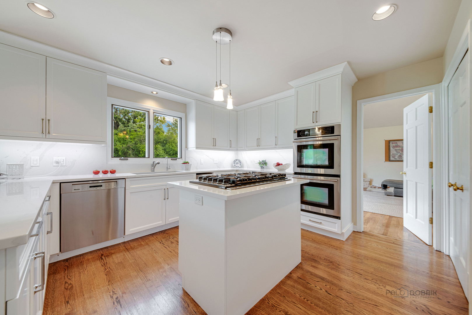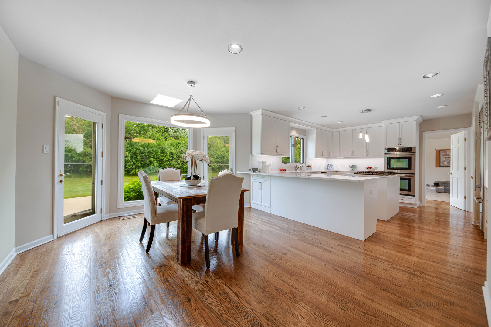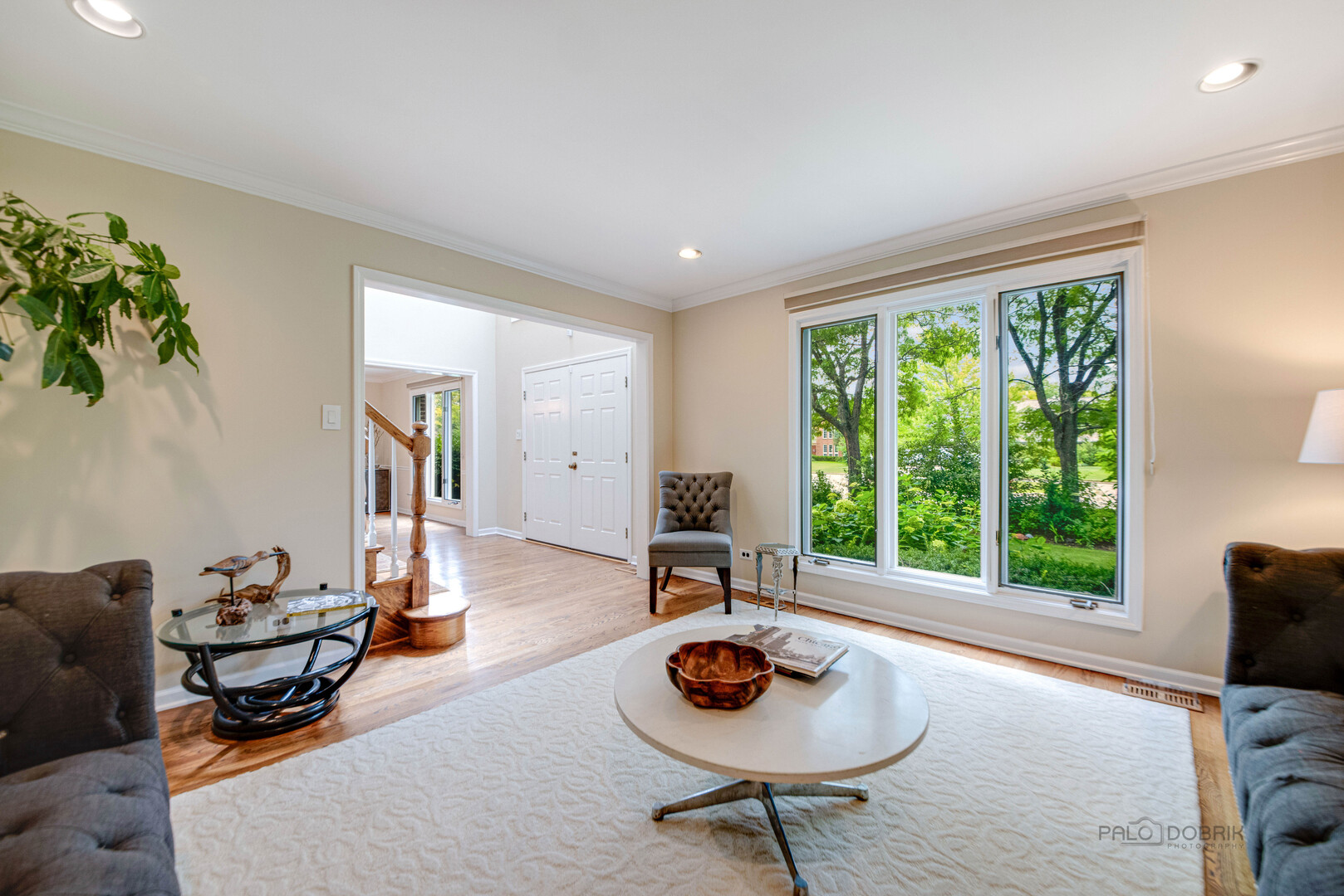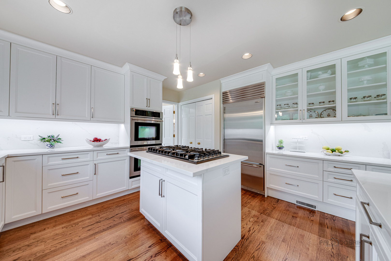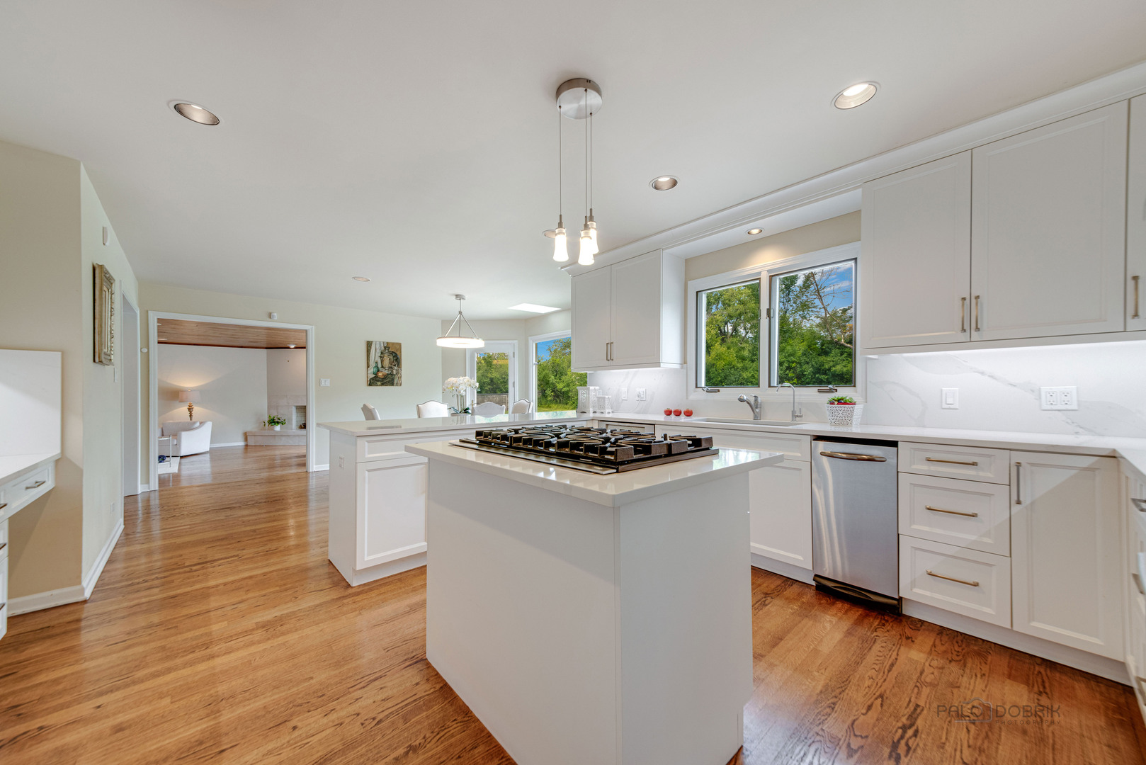 At the end of a quiet cul de sac, this East Lake Forest brick home, with NEW ROOF '24, sits on almost an acre with fenced in backyard, creating a private oasis! Located in desirable Onwentsia Gardens, this 5300+ sq foot home, on all three levels, is filled with sensational natural light and gorgeous hardwood floors throughout. The lovely double front doors open to a foyer, formal dining and living room. The gourmet white kitchen, completed in '18 features quartz countertops, a six burner Viking cooktop, Miele dishwasher, Sub Zero refrigerator, Jenn Air double oven, and generous cabinet storage space with under counter lighting. There is a large breakfast area with a wall of windows and doors, overlooking the large amazing patio and fenced in backyard. The windows and doors overlooking the backyard extends into the large family room and office/study that provide great flow for indoor/outdoor living! The home offers two fireplaces, in the family room and study/office, with dramatic shiplap ceilings and gleaming hardwood floors. Additionally, the first floor has a powder room off of the foyer. All four spacious bedrooms are on the second floor. The primary suite is very large with a luxurious master bath that has two separate dressing areas, each with a walk in closet and separate sink areas, leading to the extensive primary bathroom with steam shower and Jacuzzi tub with skylight. Bedroom 2, 3 and 4 are generously sized with oversized closets. There is an additional full bathroom on the second floor. The finished basement provides added living space with room for an exercise area, entertaining or game area with another full bathroom! You'll appreciate the fully fenced in yard with attractive patio, newer Weber grill and large area to play ball! The first floor laundry features a newer Bosch Washer & Dryer. A deep 3 car, garage with newer garage doors '18, with a sidewalk door access, to a dog run. There is plenty of space for a pool, tennis court or putting green. Improvements include New Roof '24 sump pumps with battery backup system '23, designer light fixtures '23, sprinkler system and 2 zoned A/C & HVAC, interior painting '23. Homeowner added privacy fence on side and in front of the property '19, invisible pet fence '20, additional insulation in attic and crawl space in '22, outside trim painted '22. This home is sunny and bright with so much flexibility in the floorplan and a fantastic location near great walking paths, close to highway, school, park and shopping!